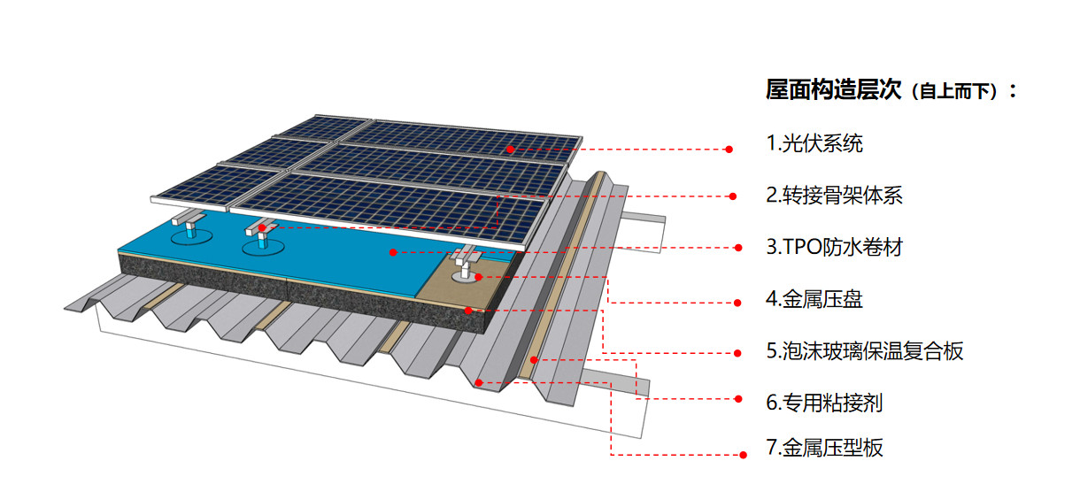 基層處理→粘貼保溫復(fù)合板→金屬壓盤(pán)錨固→粘貼高分子防水卷材→安裝光伏支架→安裝光伏板