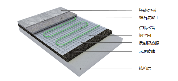 濕法地暖系統(tǒng)由熱源、分集水器、溫控、保溫隔熱層、采暖管道、細(xì)石混凝土蓄熱層、飾面層組成,加熱部件敷設(shè)在絕熱層之上,需填充混凝土或水泥砂漿后再鋪設(shè)地面面層的地面輻射供暖供冷形式。