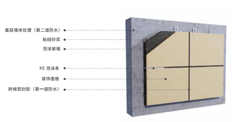 | ![]() | ? 以天然薄石材為裝飾層,通過工廠化預制工藝復合保溫芯材而成的保溫裝飾板。 ? 產(chǎn)品構造:8-12mm石材+泡沫玻璃 +背襯 ? 優(yōu)點:天然石材,飾面立體感強;成本降低(對比干掛石材幕墻)穩(wěn)定性好 ? 應用:適用于住宅裙樓與商業(yè)建筑、辦公樓外立面 |